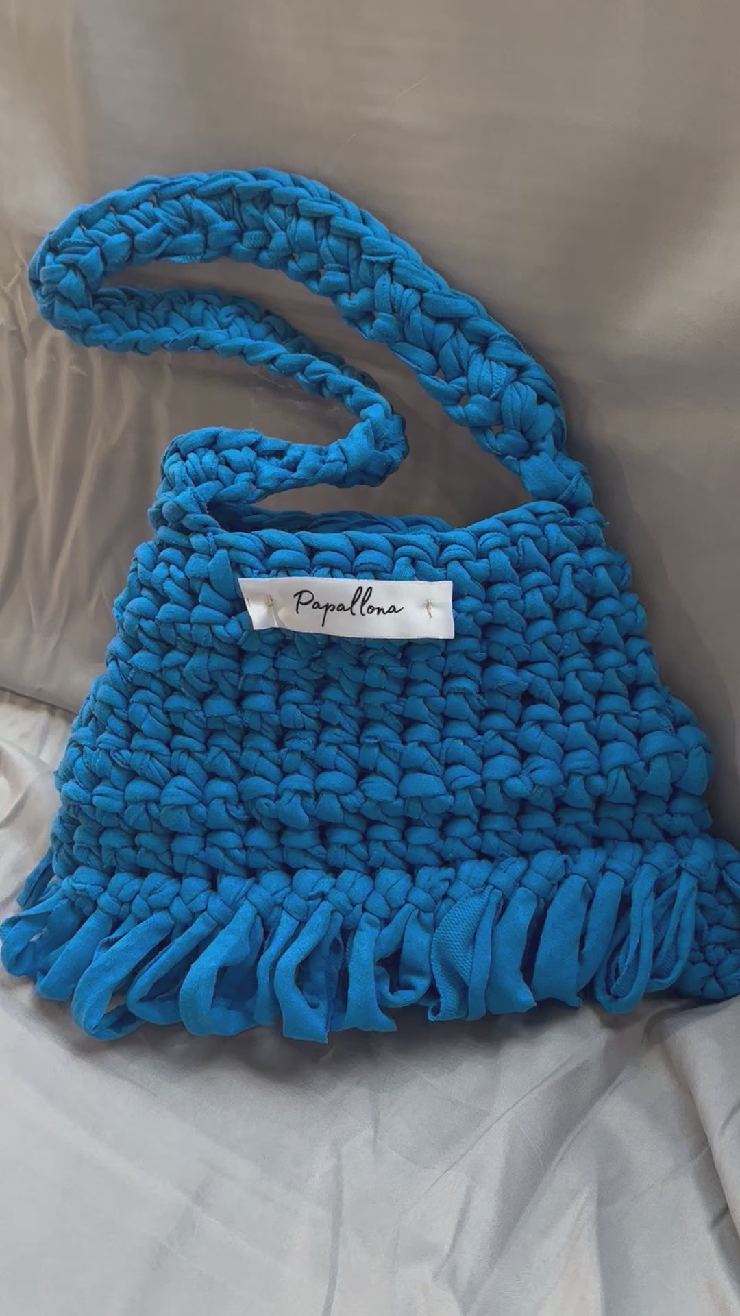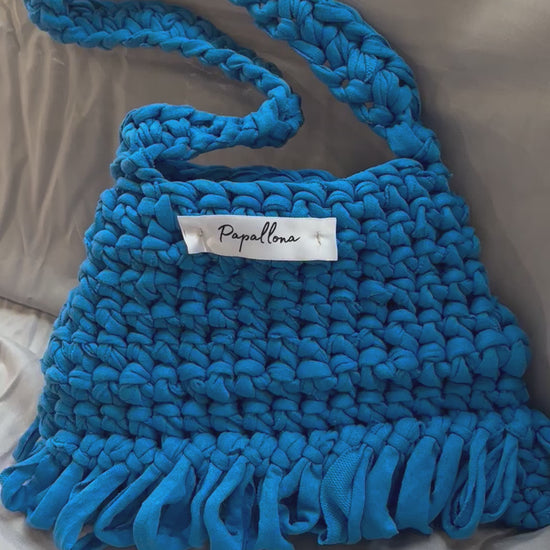 Bolso azul hecho a mano con bucles en la base y asa larga para llevar al hombro.